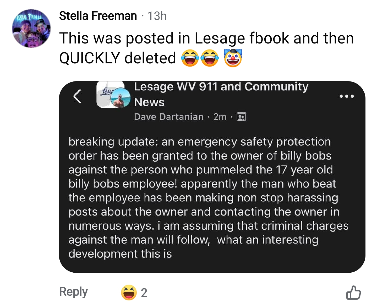 The screencap from which this was sourced indicated that Dave also posted this in Lesage WV 911 and Community News, another Facebook group. Do note that, according to Fun City LLC’s WV SOS registration, Mark lives in Lesage. Dave lives in Norfolk, Va., according to his rather empty profile.