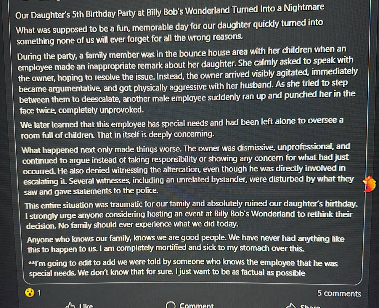 The entire situation was traumatic for our family and absolutely ruined our daughter’s birthday. I strongly urge anyone considering hosting an event at Billy Bob’s Wonderland to rethink their decision. No family should experience what we did today.
